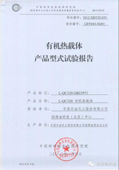 第三,選擇導熱油要看油品的質量,只有通過國標要求的產品才是合格產品,國內導熱油的權威評定機構為中國鍋爐水處理協會,為符合國家標準的產品提供產品認可證書,如長城L-QC320礦物油型導熱油型式試驗證書如下: